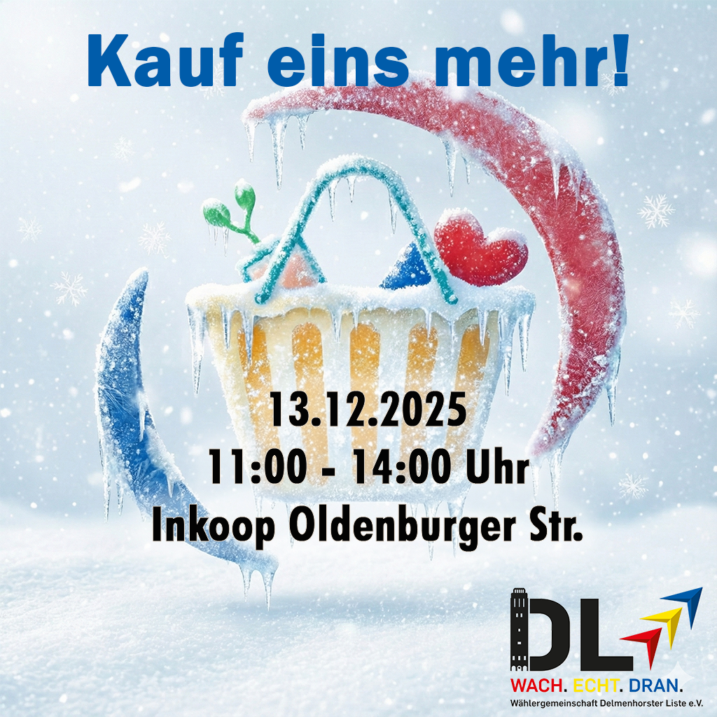 Am Sams­tag, 13. Dezem­ber 2025, ist es wie­der soweit: Die Wäh­ler­ge­mein­schaft „Del­men­hors­ter Lis­te“ e.V. sam­melt im Rah­men der Akti­on „Kauf eins mehr!“ Spen­den für die Tafel Del­men­horst und den Tier­schutz­ver­ein Del­men­horst-Schier­b­rock.